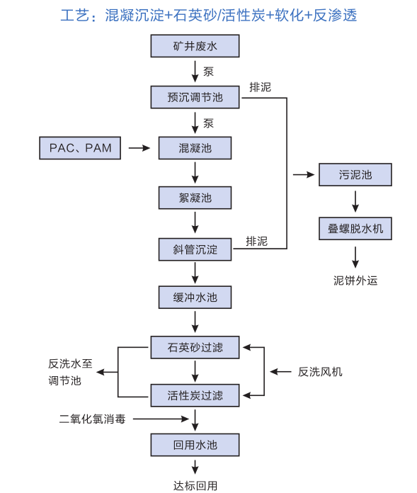 凈化處理技術主要有沉淀、混凝沉淀、混凝沉淀過濾(混凝澄清過濾)等,根據處理后不同的用途采用不同的工藝組合。