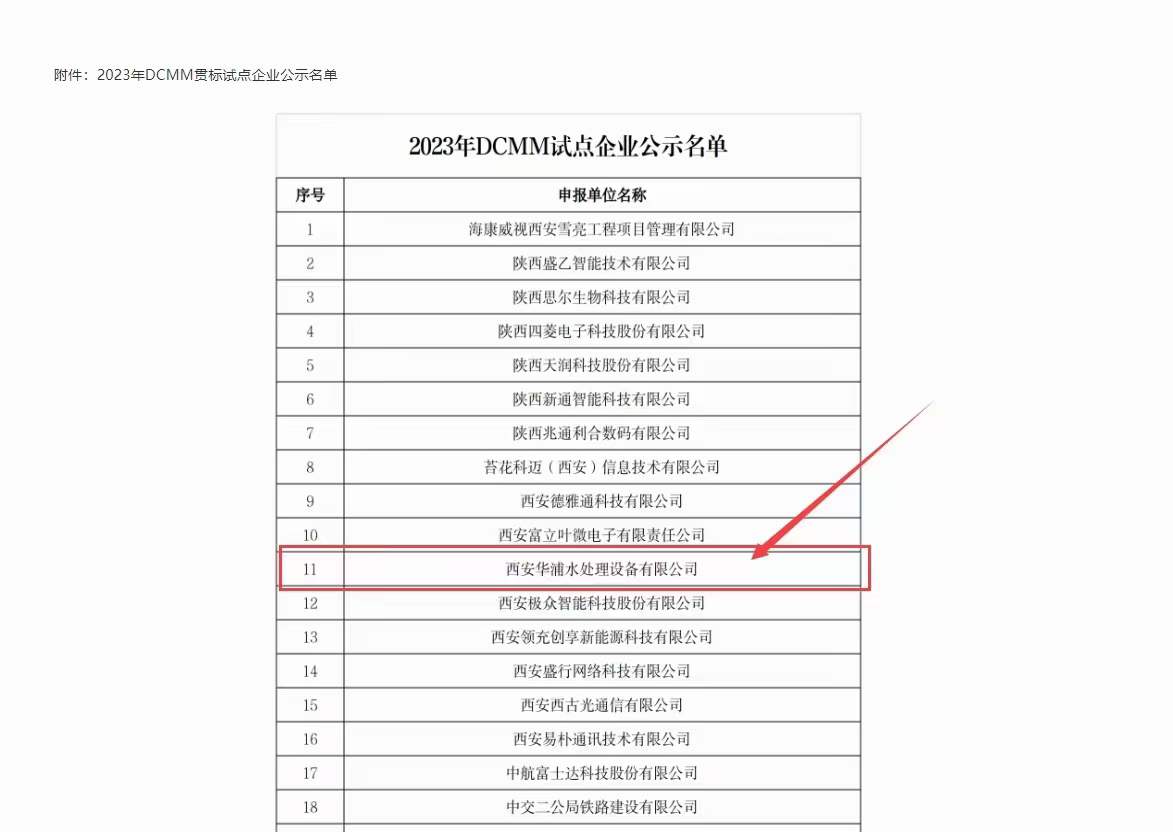 西安華浦水處理設(shè)備有限公司入選2023年度陜西省DCMM貫標(biāo)試點(diǎn)企業(yè),為水務(wù)系統(tǒng)數(shù)字化、網(wǎng)絡(luò)化、智能化發(fā)展貢獻(xiàn)華浦力量。