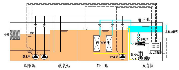 主要包括一下五大單元:(1)調節(jié)池、(2)缺氧池、(3)MBR池、(4)設備間、(5)清水池