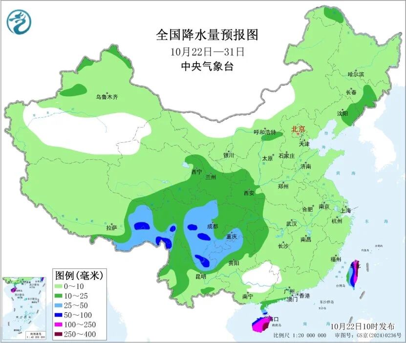 據(jù)預報,未來10天(10月22—31日),西北地區(qū)東南部、西南地區(qū)大部、西藏東部等地累計降水量有10~30毫米,局部50~70毫米;華南沿海及中國臺灣地區(qū)累計降水量達30~70毫米。